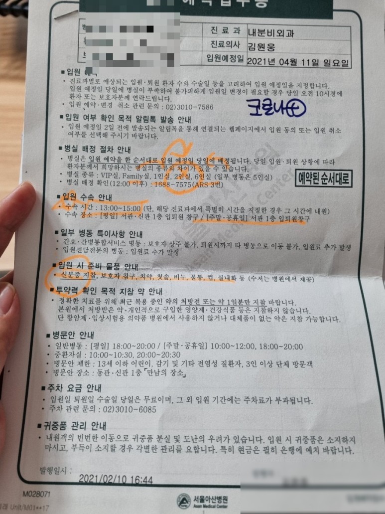 참고로 저는 2021년 4월 12일 아산병원 김원웅 교수님께 수술이 있었습니다.아산병원의 경우는 하루 전 입원하고, 2박 3일 입원이므로 수술 다음날 퇴원입니다.저는 검색도 별로 해본 적이 없어서 이것도 모르고 갔어요. ㅠㅠ혹시 집에 가기 힘드신 분들은 요양병원이나 호텔예약을 해두시길 추천드려요! 그리고 제 생각에는 보호자가.. 수술 당일은 있었으면 좋겠네요.저는 동생이 따라다녔어요.(남편은 아이를 봐야 하니까)