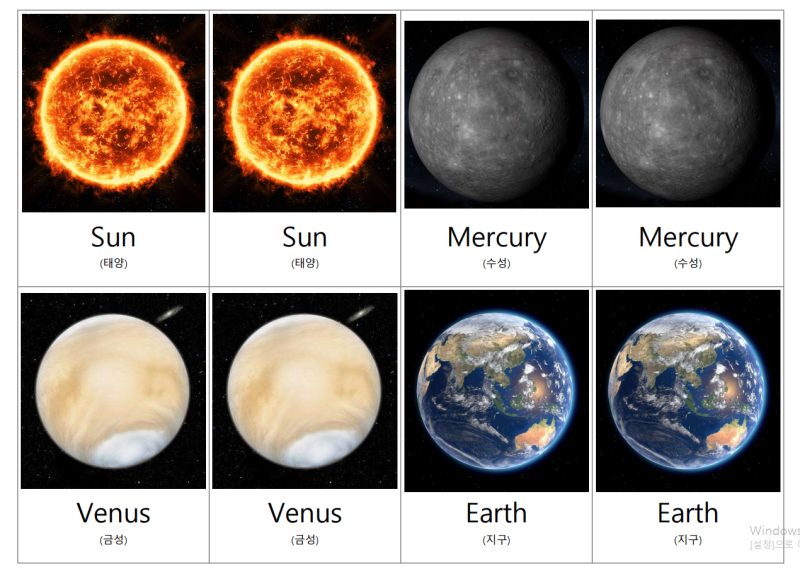 우선 행성 몬테소리 교구식 원목 제품은 직접 구입합니다.태양계 행성 그림 카드는 원목이라 너무 비싸서 내셔널 지오그래픽 키즈 우주책과 위키백과를 검색해서 직접 만들었습니다.아래 첨부파일로 공유합니다.^^) 태양계 행성의 영문명