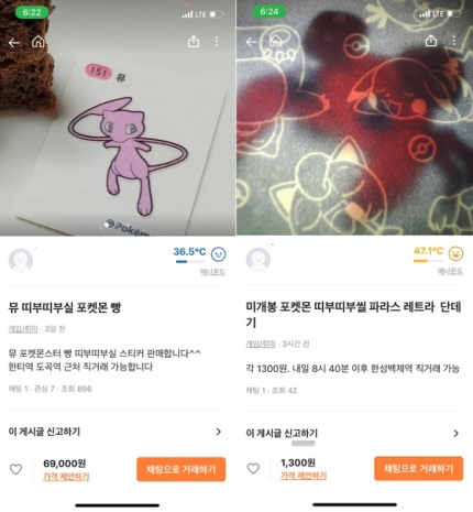 포켓몬 팬뮤트의 희귀한 포켓몬 ‘뮤’와 ‘뮤츠’가 그려진 스티커는 5만원에 거래되기도 하는데 이건 좀 에바네요.