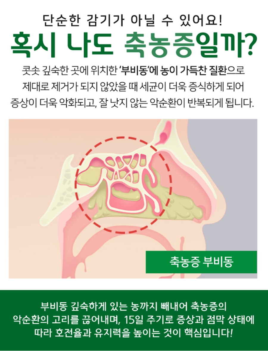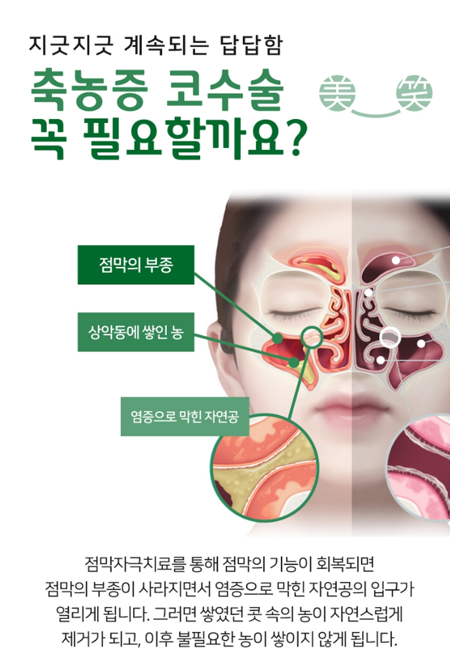 콧속의 농도를 제거합니다.무엇보다 초반에 분당 축농증의 콧물 제거가 제대로 이뤄지지 않고 방치되다 보면 막혀 있는 것 같은 불편함뿐만 아니라 전체적인 제 삶의 질까지 떨어질 수밖에 없었습니다.