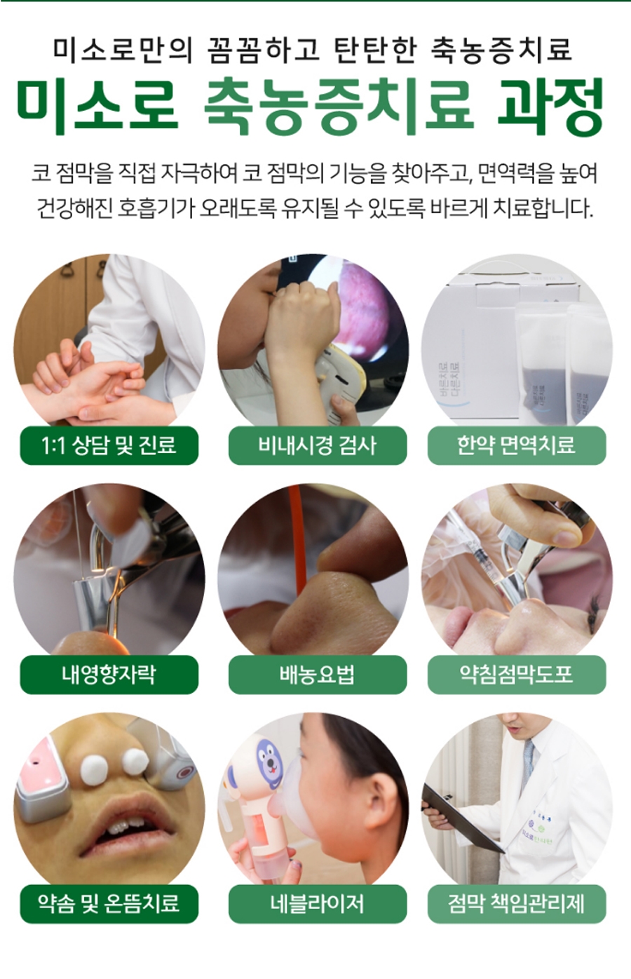 저희 병원에서는 점막 책임 관리제라고 하는 시스템도 준비되어 있습니다. 호전된 후에도 다시 호흡기의 불쾌감을 줄일 수 있도록 꾸준히 상태를 체크하고 있으니 일상을 불쾌하게 만드는 코, 인후통을 현명하게 예방해 보세요!