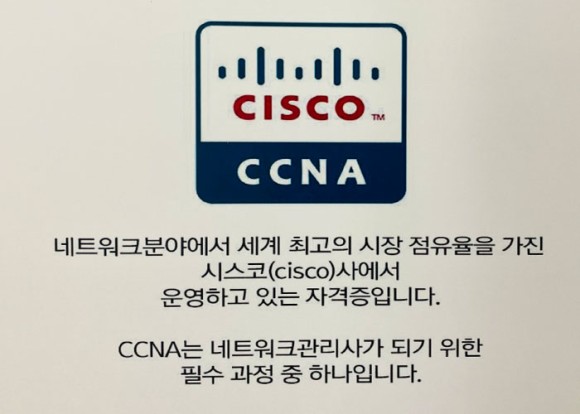 CCNA 자격이란?전 세계 네트워크 하드웨어 장비를 독점하고 있는 CISCO 주최 국제자격 네트워크 엔지니어로 취업 시 자격증 취득 여부에 따라 기업의 형태, 연봉, 분야가 다르기 때문에 취업을 준비하는 학생이라면 반드시 취득해야 하는 자격증입니다.