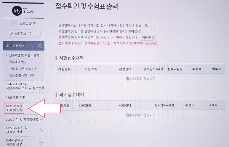 로그인하시면 본인의 시험접수 관련 메뉴가 나옵니다. 여기서는 이렇게 최근 또는 과거에 접수한 시험 내역 등을 확인할 수 있습니다. 이때왼쪽을보면자격증신청또는조회관련메뉴가계속보입니다. 이 중 다른 것이 아니라 왼쪽에 있는 ‘MOS 자격 조회 및 신청’ 버튼을 눌러보세요.