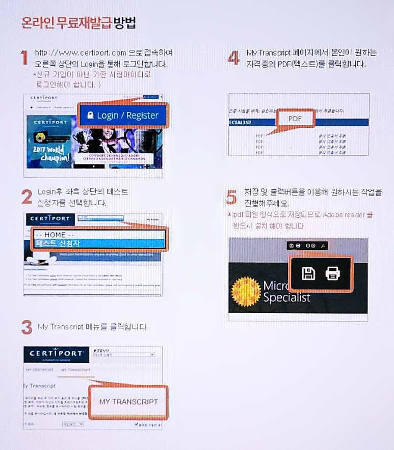 그 다음 위 사진과 같이 홈페이지 초기화면에서 ‘테스트 신청자’를 찾아 선택해 보세요. 그리고 아래에 보이는 My Transcript 메뉴를 클릭해보세요. 그럼 그 다음 페이지에서 본인이 확인하고 싶은 자격을 선택할 수 있을 겁니다. 이 중에서 하나를 선택하면 저장 또는 출력할 수 있는 전용 창이 나옵니다. 그러면 자격증을 확인하거나 발급받으면 됩니다. 이렇게 대략적인 MOS 자격 조회 방법에 대해 알아보았습니다.