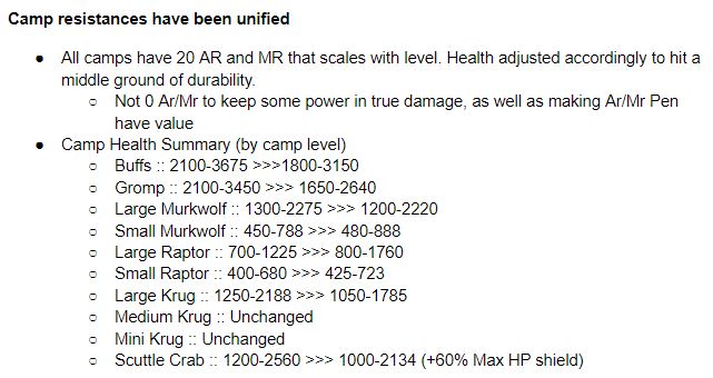 프리시즌부터 모든 정글캠프는 초기 20부터 레벨에 따라 올라가는 방어력과 마법 저항력을 보유합니다. 체력도 적당한 내구성을 유지하기 위해 조절되고 있습니다.