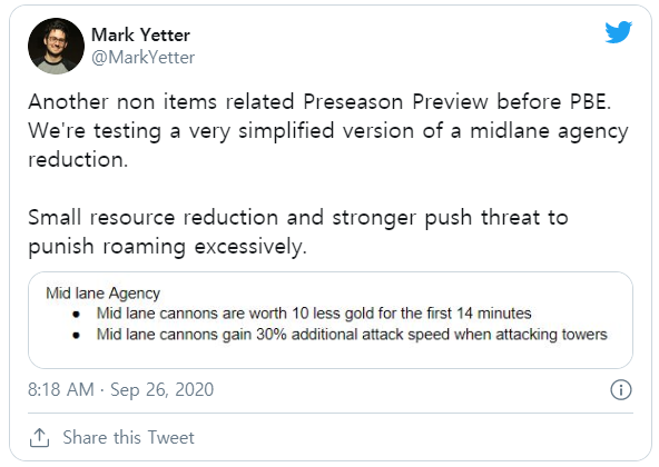 미드라인 대포미니언은 게임 시작 후 14분까지 최종전에서 10골드가 적고 타워를 공격하면 30%의 추가 공격속도를 얻습니다. 이러면 미드에서 죽는 챔피언들은 적 챔피언이 로밍하러 갔을 때 포탑의 방패를 더 잘 긁겠죠.