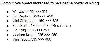 • 레드/블루 버프몹 : 2100-3675-> 1800-3150 * 두꺼비 : 2100-2640 * 큰늑대 : 1300-2275-> 1200-2220 * 작은늑대 : 450-788 -> 480-888 * 큰날구 : 700-1225-> 800-1760 * 작은날구 : 400-680-> 425-723 * 큰돌거북 : 1250-1785 * 중형돌거북 : 변경사항없음 * 소형돌거북 : 1000-26:60