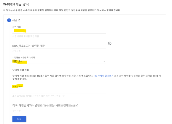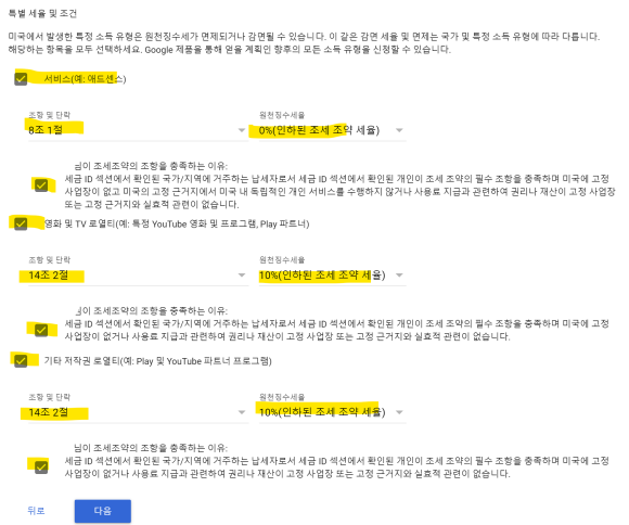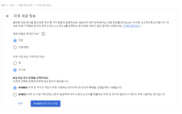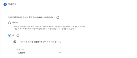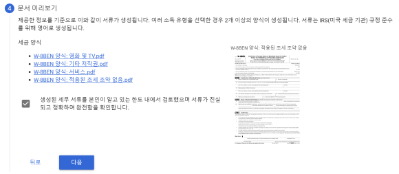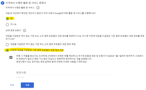 미국에서 시청된 기록이 1건이라도 있으면 6번에서 예 이전에 대금을 받은 기존 결제프로필의 세금 정보 제공을 클릭해야 한다.