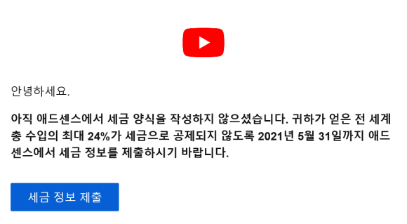 상기 메일의 내용의 포인트는, 어드센스세 양식 작성하지 않으면 광고료 중 24%를 그대로 가져가 버린다는 무서운 이야기.^ 내 피 같은 유튜브 광고 수익인데…! 가져가게 놔둘 수는 없지