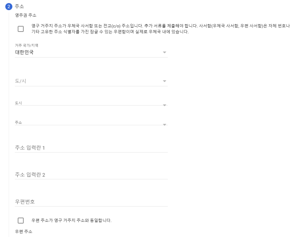 주소는 무조건 영어로 쓰지 말아야 한다 클릭으로들어가는부분은한글로표시되지만주소입력란의1,2는영어로작성해야한다는것을잊지마세요.