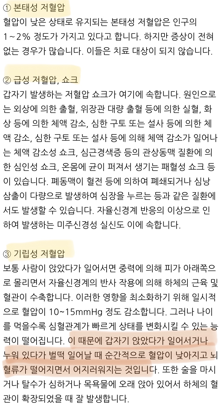 저혈압 증상이 나타나면? 어지럼증이나 실신 등 급성 저혈압 증상이 나타나면 즉시 병원을 찾아야 합니다.저혈압일 때는 누워 있는 것이 도움이 되고, 하지의 혈액이 주요 장기로 갈 수 있도록 다리를 올리는 것도 도움이 된다고 합니다.