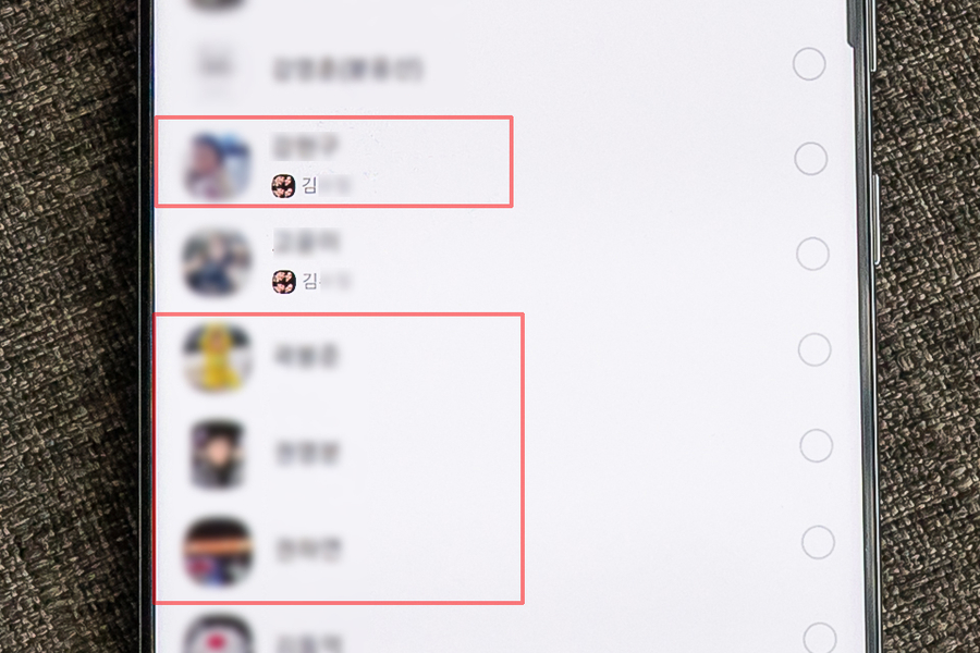 상기 작성 과정에서 돌아가서 지정하는 친구 목록 탭으로 다시 이동하도록 한다. 그러면 각각의 친구 이름 아래에 어떤 profile이 송출되어 있는지 표시된다. 위의 사진을 예로 들어보자. 붉은 탭으로 그려진 범위에서 상단에 1명과 하단 3명의 차이가 확인된다. 상단 1명은 지정된 상태로 보면 된다.