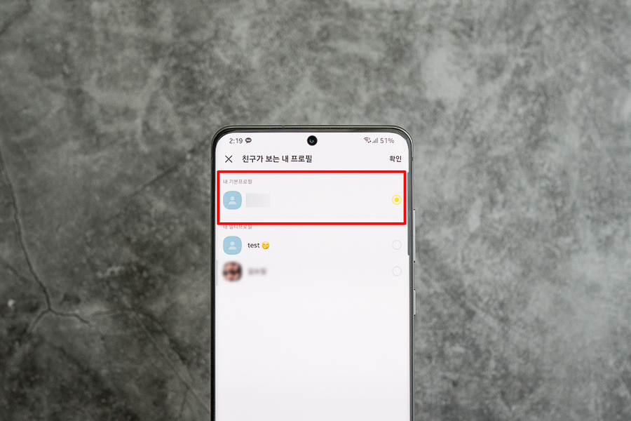 그러면 친구들이 보는 나의 profile이라는 화면이 뜨고 거기서 나의 어떤 계정이 보이는지 확인할 수 있다. 사진에서는 기본적으로 보인다고 표시되어 있다. 잘못 지정된 상태라면 원하는 계정을 터치하고 확인 버튼을 눌러 변경해준다.
