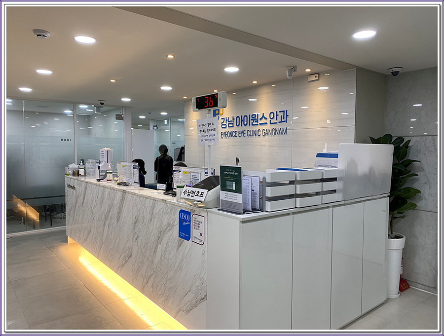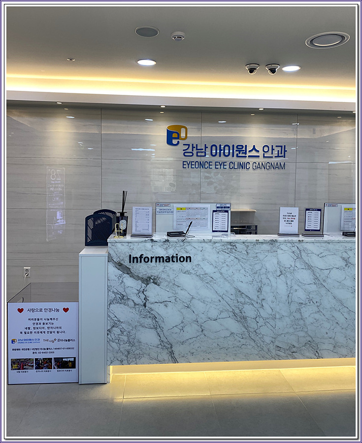 강남아이원스안과는 신논현역 7번 출구로 나오면 교보타워 옆 빌딩에 위치해 있는데 안과 내부는 크고 깨끗하고 대기시설도 잘 되어 있어 매우 만족감이 컸다.