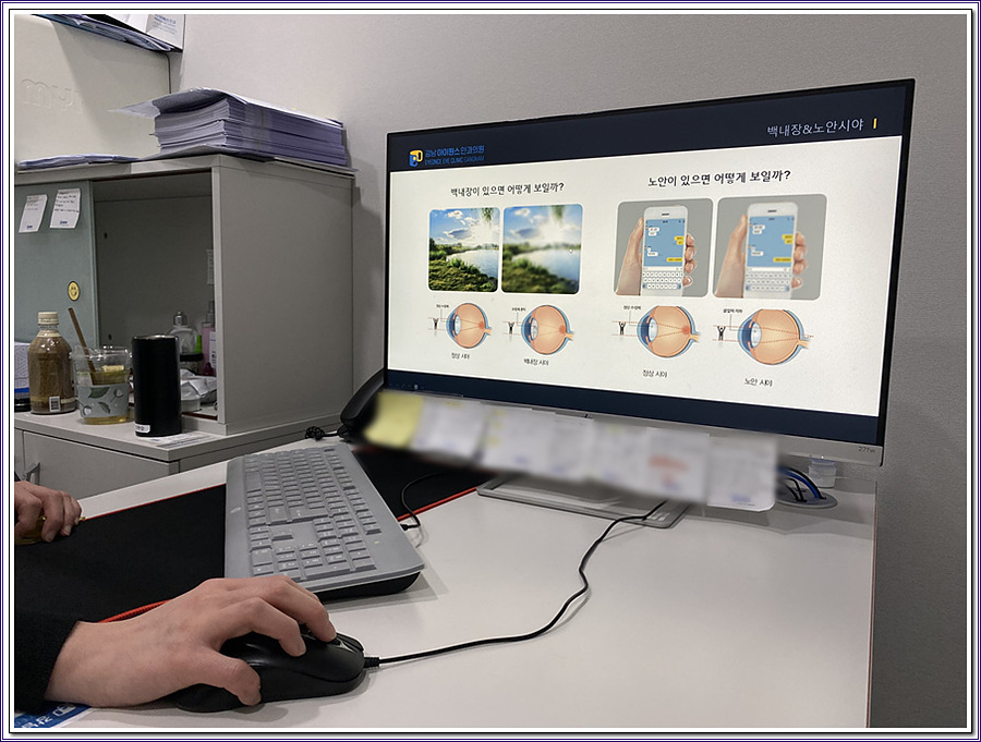 검사 진행 후 잠시 대기하다가 원장 진료를 받았는데 이런.. 제가 노안백내장이라 한다.다행히 최근에는 흔한 안구질환으로 수술하는 사람도 많다며 원장님이 쉽고 자세하게 노안백내장에 대해 설명해줬다.