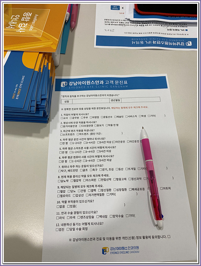 50세가 넘어서 갱년기까지 와서 노안에게… 시력도 점점 나빠지는 느낌이 들기 시작했다.단순한 노안이나 나이가 들어서 그런가 싶어 점점 눈앞이 새하얗고 심해지는 증상으로 안과검진을 받는 게 맞다고 생각해 강남아이원스안과를 방문하게 됐다.