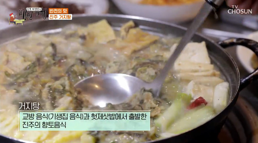 진주의 향토음식 거지국도 맛본대요. 옛날 거지들이 동네 양반집 제사에서 사냥해 온 음식을 가지고 만든 음식이래요. 이름은 거지탕인데 부추정미, 육전, 동태전 등 6가지 전과 참돔, 민어, 조기, 우럭, 서대까지 들어가 양반집 음식 못지않은 맛을 갖추고 있다고 합니다.