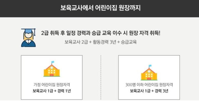 보육교사 1급 자격증 취득 후 경력 +1년 가정어린이집 원장 자격 취득! 보육교사 1급 자격증 취득 후 경력 +3년 300명 이하 어린이집 원장 자격 취득!