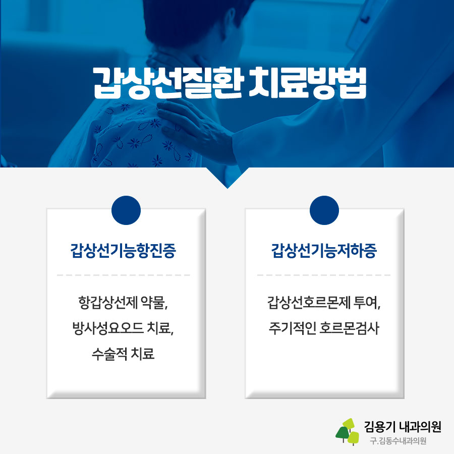 갑상선 질환 치료 방법 ▶ 갑상선 기능 항진증 치료 – 항갑상선 약을 지속적으로 복용하여 갑상선 기능을 정상화시킵니다. 재발하는 경우도 있으므로 정기적인 검사를 실시하고 재발 시 약물치료를 반복합니다.- 방사성 요오드 치료 – 수술적 치료