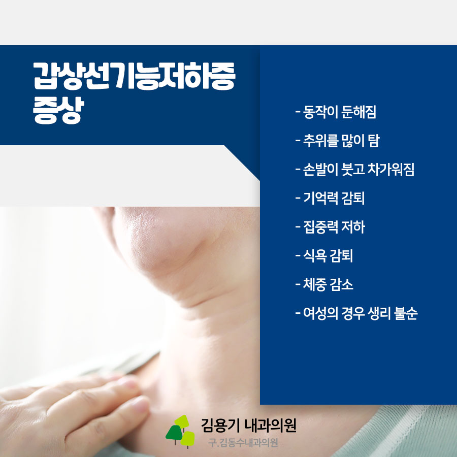 ▶ 갑상선 기능 저하증 증상 – 동작이 둔해지다 – 추위를 많이 느끼다 – 손발이 붓고 차가워지다 – 기억력 감퇴 – 집중력 저하 – 식욕 감퇴 – 체중 감소 – 여성의 경우 생리 불순