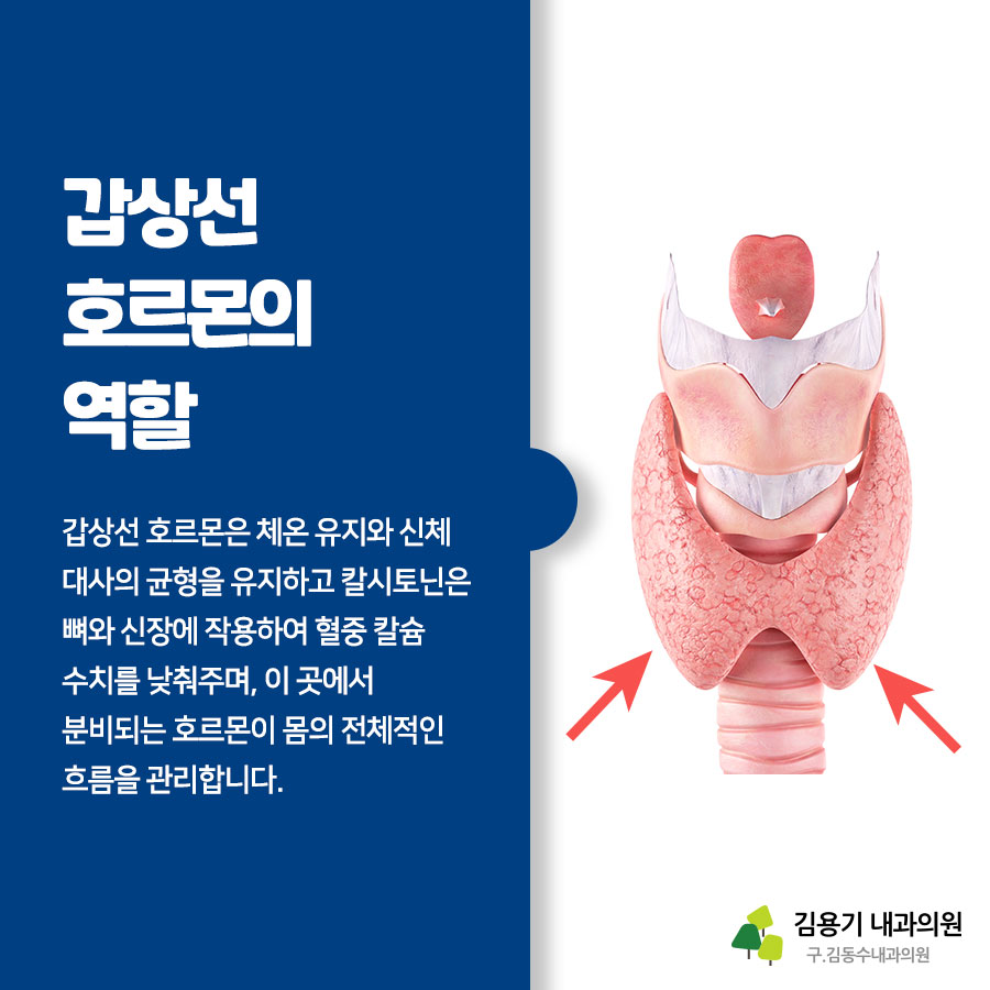 갑상선 호르몬 역할 갑상선 호르몬은 체온 유지와 신체 대사의 균형을 유지하고 카르시토닌은 뼈와 신장에 작용해 혈중 칼슘 수치를 낮춥니다. 여기서 분비되는 호르몬이 몸의 전체적인 흐름을 관리하는데 호르몬이 정상보다 많이 분비되는 상태를 갑상선기능항진증이라고 하며 신체대사활동이 늘어나 심한 더위와 이유 없는 체중감소가 일어나게 됩니다. 반대로 호르몬 농도가 결핍되거나 저하되어 추위를 느끼거나 만성 피로가 느껴지는 것을 갑상선 기능 저하증이라고 합니다.