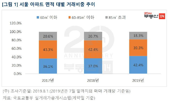 새 아파트 선호, 대출 규제 등의 영향으로 소형 거래 증가 아파트 매매 거래량이 크게 줄어든 가운데 올해 서울 아파트 시장에서는 전용 60㎡ 이하 소형 매매거래 비중이 증가한 것으로 조사됐다. 부동산114(www.r114.com)가 국토교통부 매매 실거래가 자료를 분석한 결과 2019년 7월 말까지 서울 아파트 거래 건수 1만9244건 중 전용 60㎡ 이하 거래 비중은 42.4%(8168건)로 2018년 37.0%(3만79건)에 비해 5.4%p 증가했다. 반면 2018년 거래 비중이 42.4%로 가장 높았던 전용 60~85㎡ 이하는 올 들어 거래 비중이 3.1%p 낮아졌고 전용 85㎡ 초과 거래 비중도 2.4%p(2018년 20.7%à 2019년 18.3%) 줄었다.