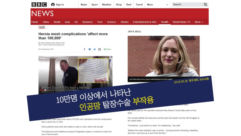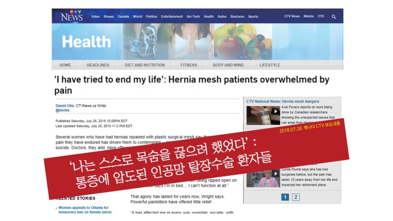 이에 따라 미국을 비롯한 세계 곳곳에서는 인공망 탈장수술을 받은 분들이 모여 집단소송을 제기할 정도입니다. 또 영국 BBC와 미국 CBS, 캐나다 CTV, 호주 ABC 등 각국 TV방송에서는 인공망 후유증에 대한 특집방송을 편성해 자국민의 경각심을 일깨우고 있습니다.