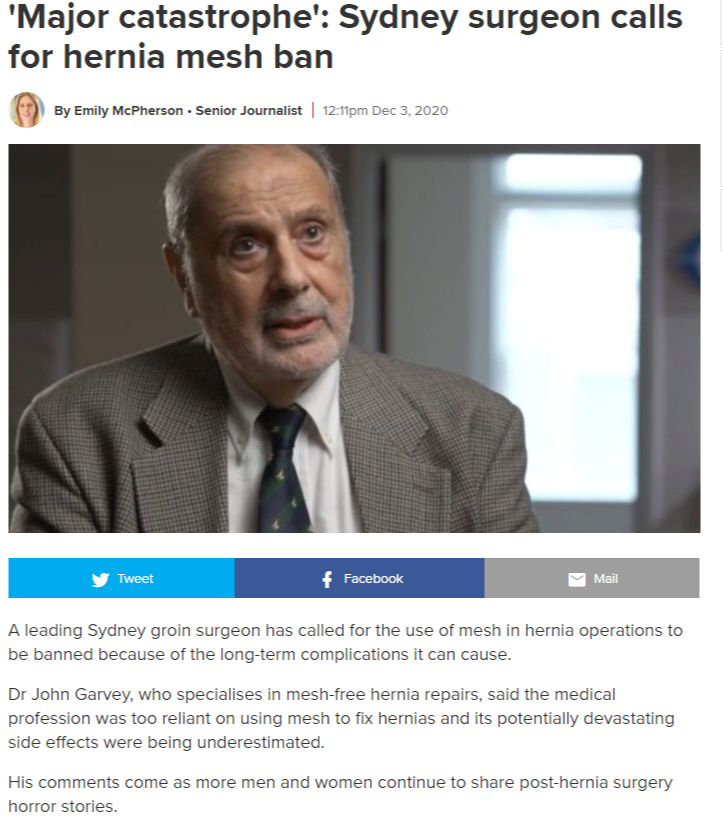 출처 : http://www.9news.co m.au/national/hernia-mesh-safety-australia-sydney-surgeon-calls-for-ban/05af1bcf-1209-4b74-8ad5-21e7d348254d 뿐만 아니라 미국 FDA 등 세계 각국의 식품의약품안전처에서는 탈장수술에 사용하는 인공망을 사용하기 전에 반드시 환자에게 인공망을 사용할 경우 부작용일 수 있음을 설명하도록 하고 있습니다. 특히 호주식품의약품안전처 TGA에서는 탈장수술에 사용하는 인공망을 ‘고위험’ 의료기기로 분류하고 있습니다. 특히 호주식품의약품안전처 TGA에서는 탈장수술에 사용하는 인공망을 모두 인공망을 ‘고위험’ 의료기기로 분류하고 있습니다.
