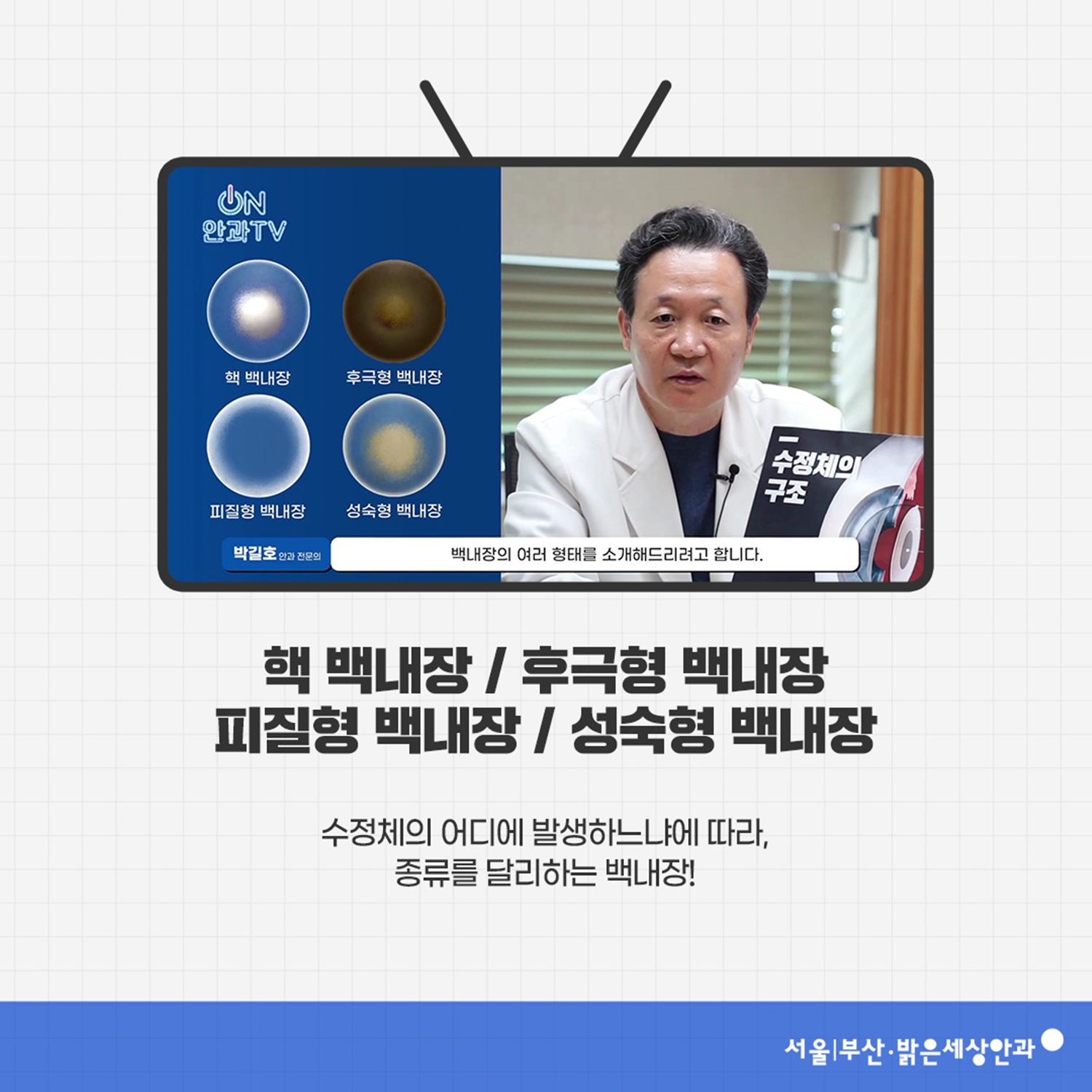 경화가 심해질 경우 제거 난이도가 높아지고 녹내장과 같은 합병증 발생 가능성이 높기 때문에 대부분 50~60대에서 치료계획을 세우게 됩니다.