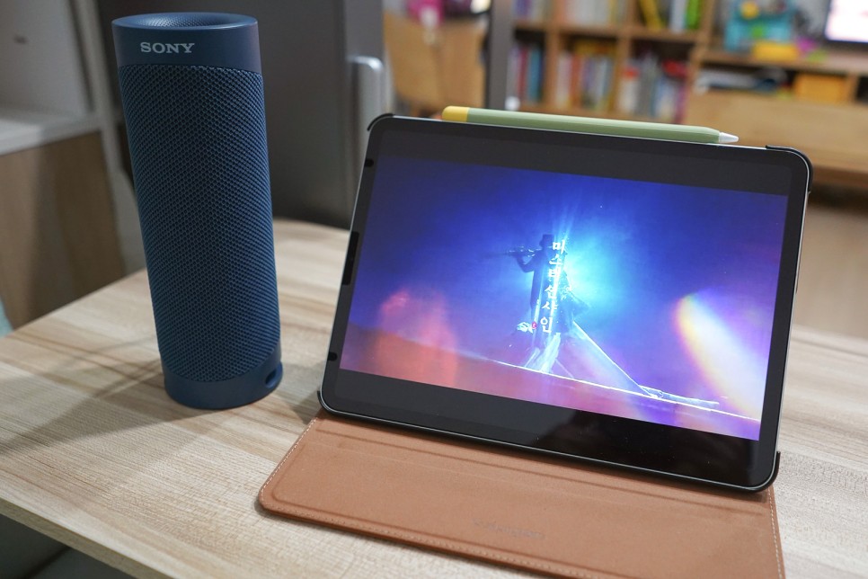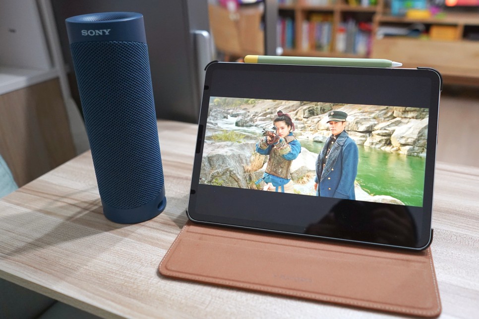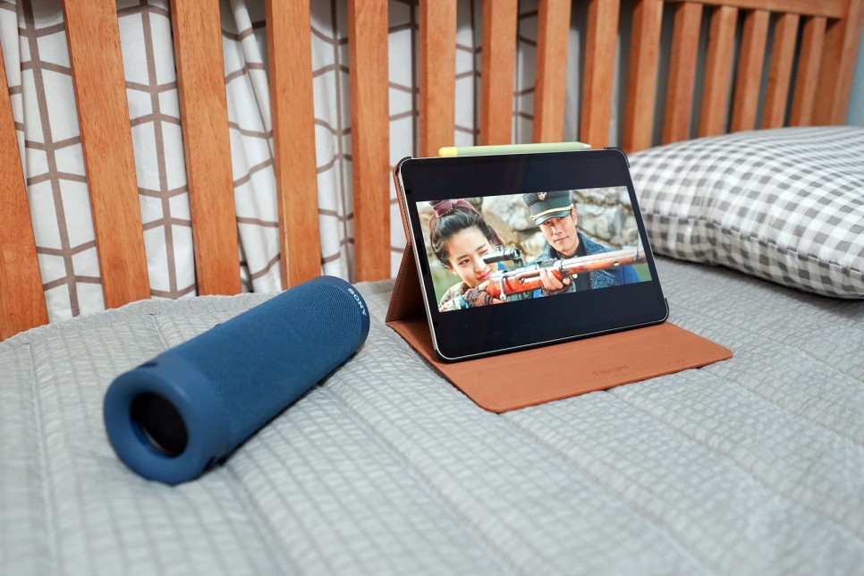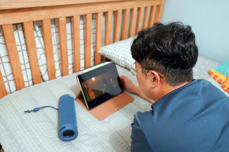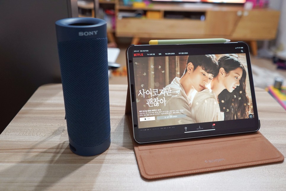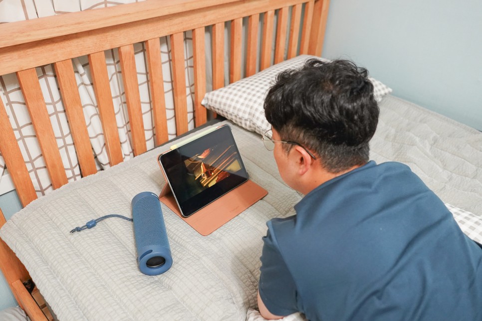 와… 음질 감동이에요. 사진으로 전할 수는 없지만 음… 너무 만족스러워요.배우가 옆에서 얘기하는 줄 알았어.이전 블루투스 버전에서는 영상과 사운드 싱크가 맞지 않아 어색할 때도 있었지만 블루투스 5.0에서는 그런 걱정이 필요 없습니다.영상 재생 시 딜레이가 최소화된 블루투스 5.0! 저는 이렇게 평소 아이패드로 넷플릭스 시청을 소파에 앉아 테이블에 올려봅니다.만, 저희는 눕방이 제일 자연스럽잖아요?ㅋ