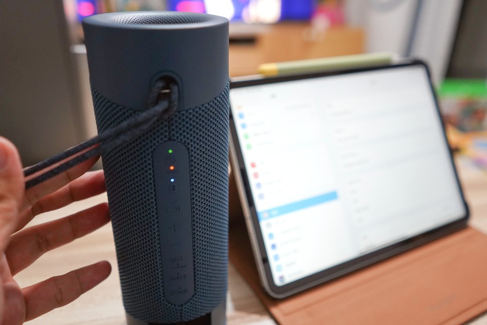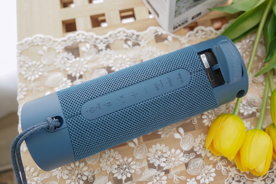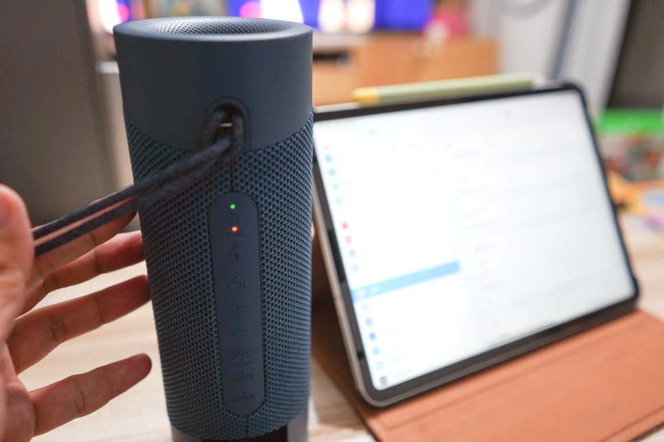그러면 아이패드와 페어링을 해서 블루투스 스피커를 사용하는 사진을 보여드리겠습니다.먼저 사용하기 전에 충전을 해야 하는데 뒤에 뚜껑(?)을 열고 USBC-TYPE 케이블을 이용하여 배를 채웁니다.