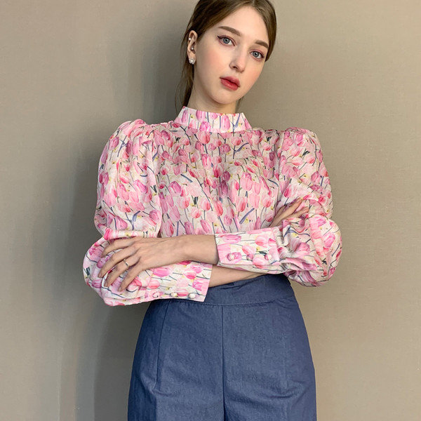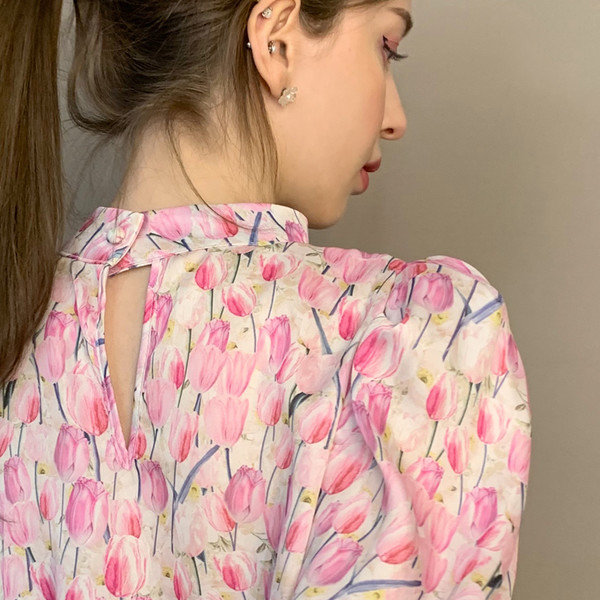 튤립 패턴이 들어간 핑크 컬러의 블라우스이지만 어깨에 퍼프 디테일이 들어가 있으며 소매는 긴 커프스에 콩 버튼으로 러블리한 룩을 연출할 수 있습니다