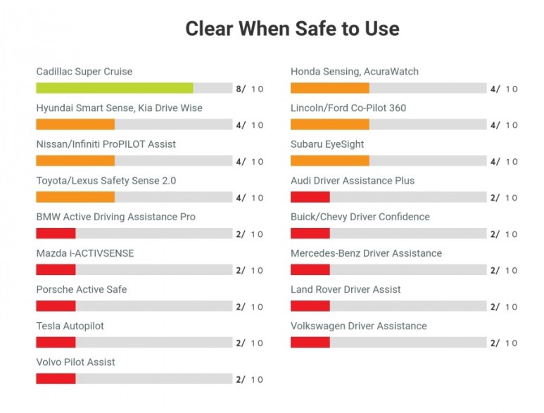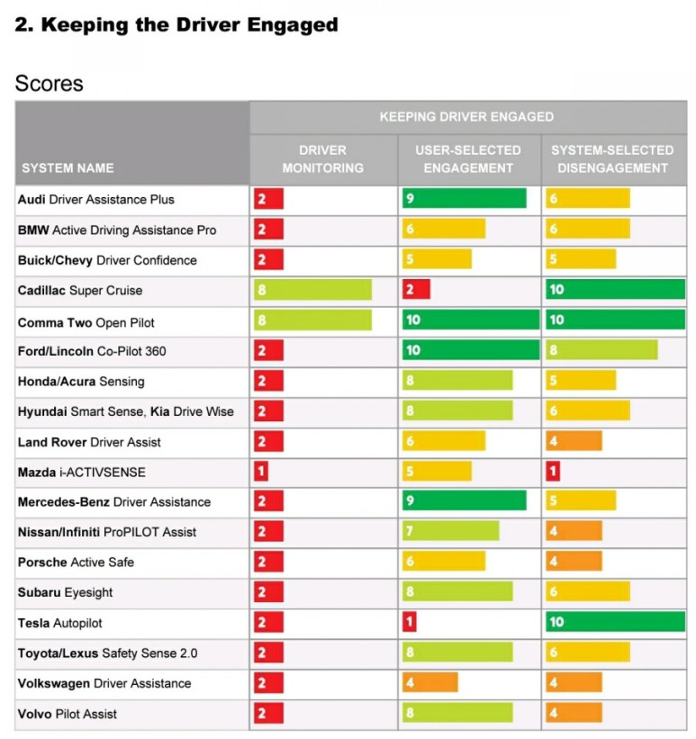 당연히 이를 지원하는 캐딜락 슈퍼 크루즈와 Comma.ai 오픈 파일럿이 “Driver monitoring” 점수가 가장 좋습니다.