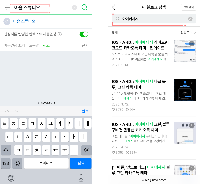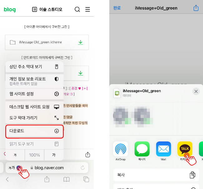 먼저아이메시지주제를다운로드해야합니다. 사파리 > 네이버포털사이트 > [이솔스튜디오] 블로그를 검색합니다. 그리고 해당 포스팅을 찾기 위해 검색에서 [아이메시지]를 검색하면 다양한 색상의 주제가 나옵니다. 여기서 마음에 드는 것을 클릭하여 포스팅 스크롤을 내리면 누구나 다운로드 할 수 있도록 공유해 주었습니다. 공감과 댓글을 통해 고마움을 전하는 센스.