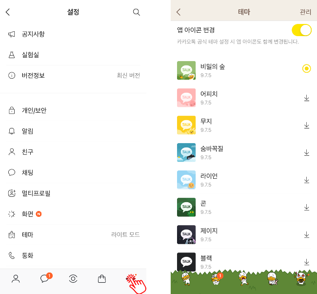 우선 기본 제공되는 카카오톡 배경을 변경하는 방법은 아이폰이나 갤럭시나 마찬가지입니다. 카카오톡 앱 실행 후 설정 > 주제로 이동하면 10가지 정도 공식 테마가 있습니다. 필자는비밀의숲으로설정해서사용해보았습니다. 그런데 생각보다 촌스럽고 번잡해 보여 깔끔한 디자인의 아이폰 아이메시지 모드로 변환하기로 했습니다.