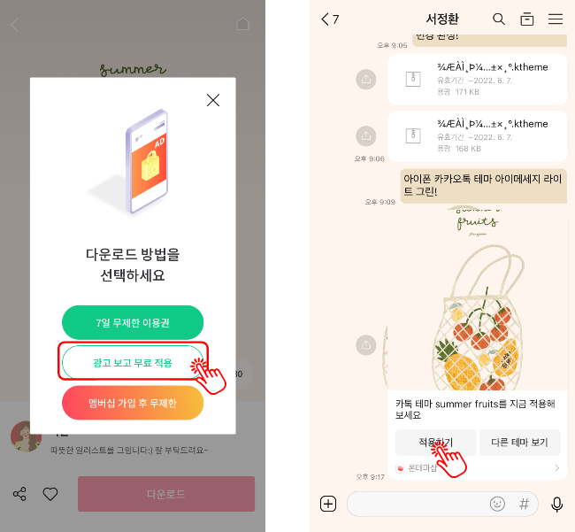 다운로드 버튼을 클릭하여 카카오톡 계정을 선택한 후 ‘내게 보낸 메시지’에서 [적용하기]를 누르기만 하면 자동으로 카카오톡 테마 관리 메뉴로 이동됩니다. [사용자 테마]에서 다운로드 받은 것을 지정하면 설정되어 있습니다.