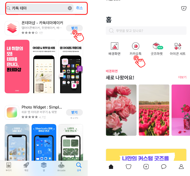 만약 필자와 다른 취향이라면 아이폰 아이메시지보다 조금 더 스페셜한 카카오톡 테마를 갖고 싶은데요. 그렇다면 앱스토어에서 [카카오톡 테마]를 검색하여 맨 위의 앱을 다운받아 설정할 수 있습니다.
