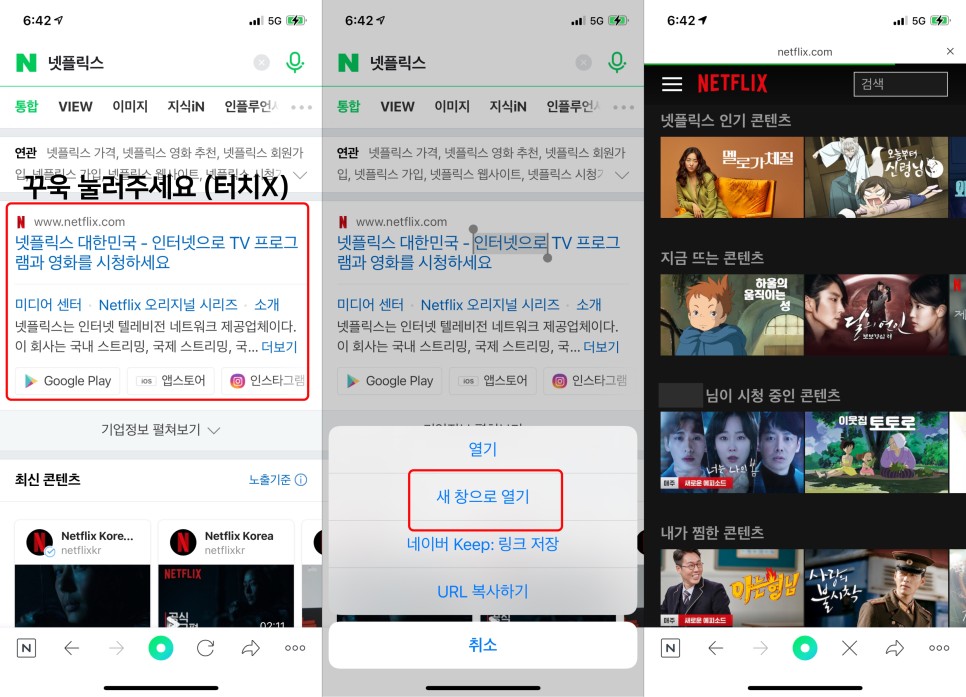 아이폰으로 넷플릭스 웹사이트 접속을 먼저 검색창에 넷플릭스를 입력하고 공식사이트를 방문합니다. 그런데 여기에서 주의해야 할 점이 있는데요. 사이트를 클릭하여 바로 접속하는 것이 아니라 2초 정도 터치하면 추가 팝업창이 나타납니다. 그 상태에서 ‘새탭 열기’를 탭하여 연결합니다. 이런 식으로 접속하면 앱으로 접속이 아니라 넷플릭스 웹사이트에서 볼 수 있습니다.