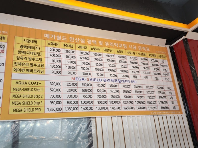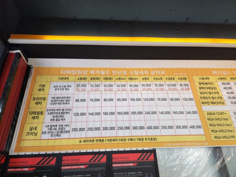 안산유리막코팅손세차전문점 메가쉴드 세차시공가격을 확인합니다.간혹 세차 전후 비용 이야기가 다를 수 있으므로 사전 견적과 구체적인 진행 항목, 비용 추가 발생 여부를 확인해 두면 좋습니다.