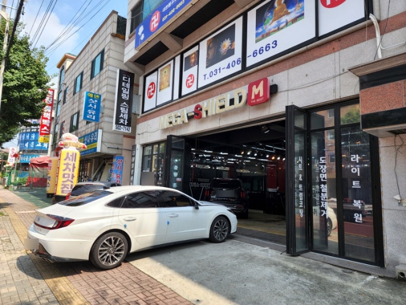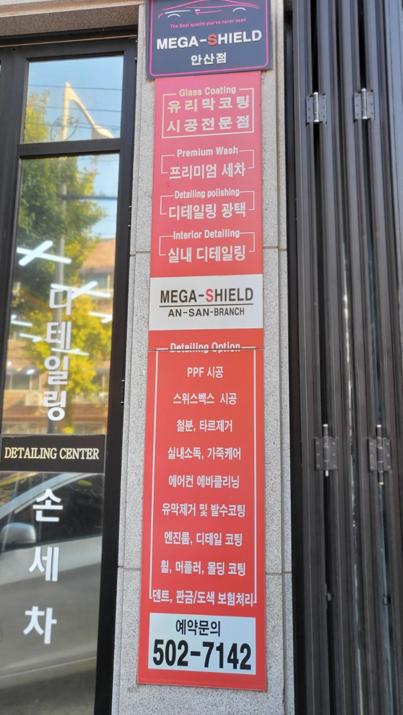디테일 세차/유리막코팅/발수막코팅 프리미엄 손세탁을 하는 메가쉴드 안산점입니다. 안산 본오동 상록수역 근처에 있습니다.