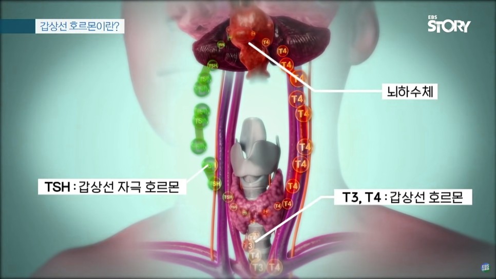 인체의 생리작용을 조절하기 위해 뇌하수체 전엽에서 갑상선 자극 호르몬이 분비되고, 이로 인해 갑상선이 자극을 받아 갑상선 호르몬 T4가 분비되게 됩니다.