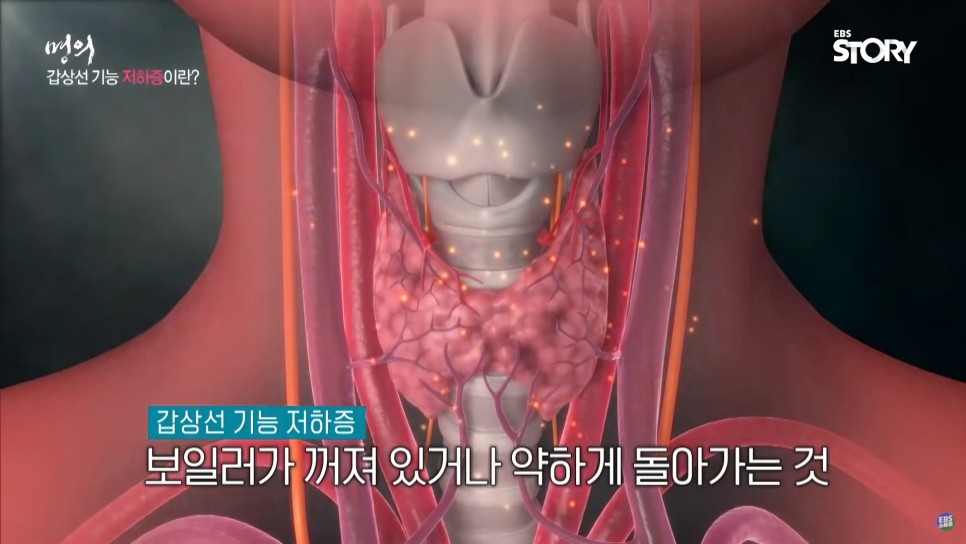 보일러의 불을 강하게 잡는 갑상선 항진증과 비교해 갑상선 기능 저하증은 연료 부족으로 보이고 보일러가 약해지는 현상에 비유합니다.