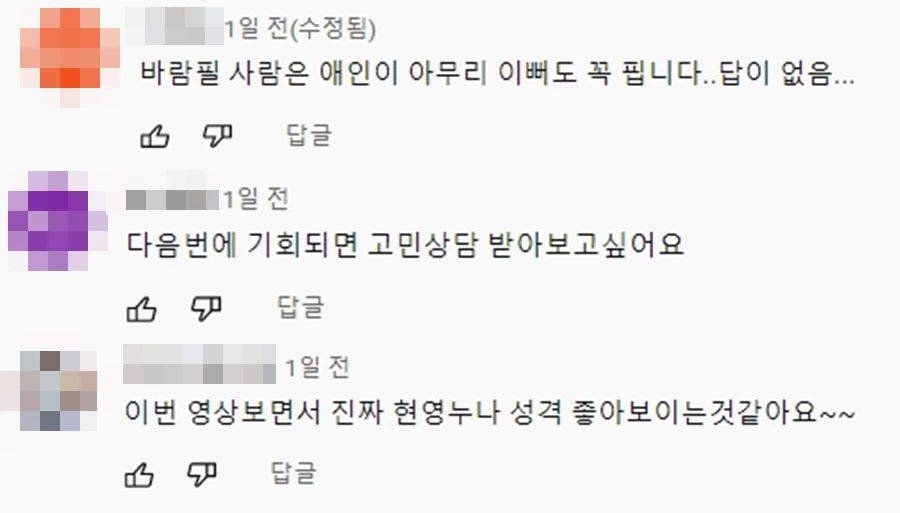 영상을 본 네티즌들은 조현영의 유튜브 댓글을 통해 “바람피는 사람은 연인이 아무리 예뻐도 꼭 피웠다”, “이번 영상을 보니 조현영의 성격이 좋을 것 같다”, “다음에 기회가 된다면 고민 상담을 받아보고 싶다” 등 다양한 반응을 보였다.