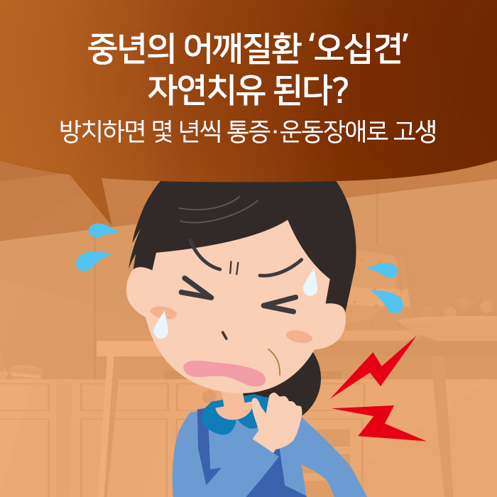 특히 어깨 근육이 점차 단단해지는 오십견은 중년에 찾아오는 당연한 증상으로 여기고 방치하는 사람이 많습니다. 흔히 ‘오십견 앓아 지나간다’는 표현을 쓰지만 감기처럼 앓으면 증상이 낫고 거의 후유증을 남기지 않습니다.
