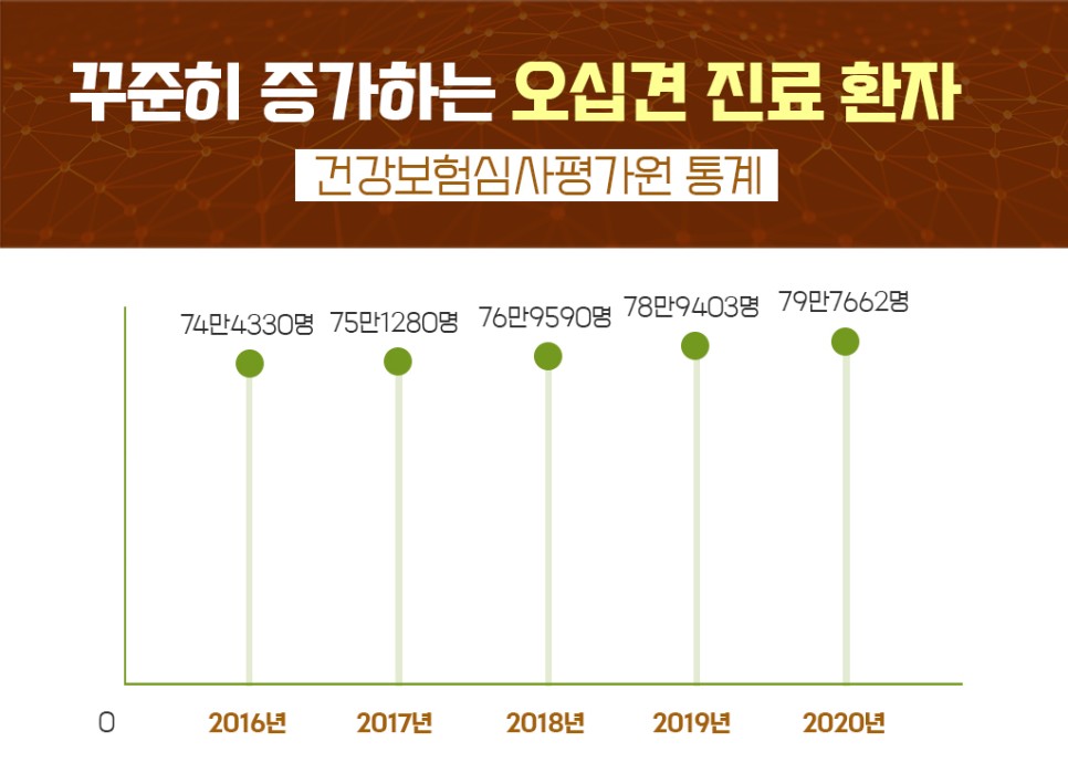 어깨 통증이나 기능 문제를 일으키는 오십견 진료 환자가 꾸준히 늘고 있습니다. 건강보험심사평가원 통계를 보면 1년에 약 80만명이 오십견으로 치료를 받습니다. 이 수치는 한방의료기관에서 진료를 받는 것을 제외한 것입니다.