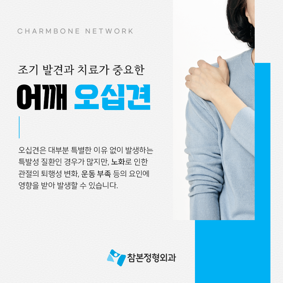 갈수록 발병연령이 낮아지는 질환인 만큼 남녀노소 일상생활에서의 꾸준한 관심과 관리가 필요할 것입니다. 지금부터라도 어깨 관절의 건강을 지킬 수 있도록 꾸준히 스트레칭, 근력 운동을 하고 정기적으로 검진을 받을 것을 권합니다.