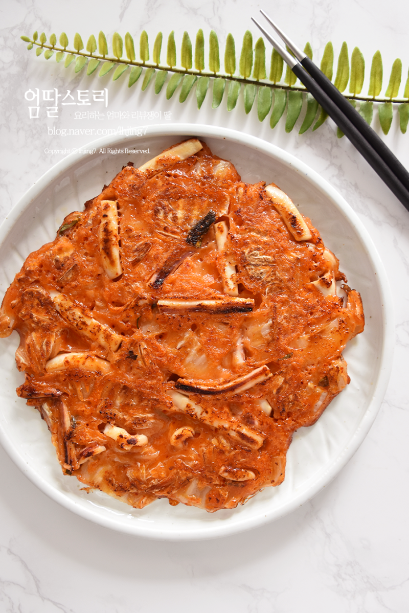 입이 궁금해서 허무할 때 해 먹기 좋은 김치전인데 그냥 김치만 넣어서 만드는 것보다 오징어가 들어가면 오징어의 쫄깃한 맛이 전을 더 맛있게 먹을 수 있겠네요.