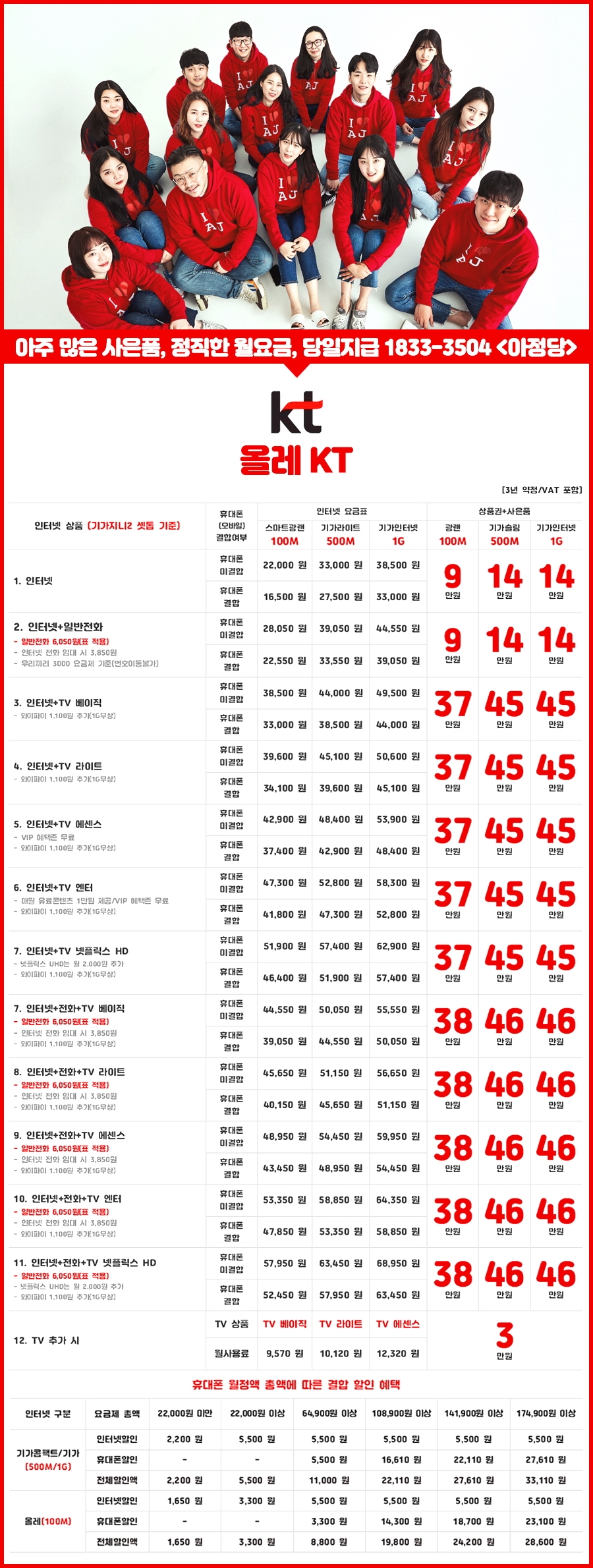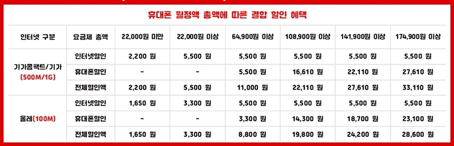 - 총액결합-인터넷+휴대폰 필수 65,890원 미만 요금제를 2인 이하 사용 시 유리하며 최소 1,650원에서 최대 33,110원까지 할인됩니다.