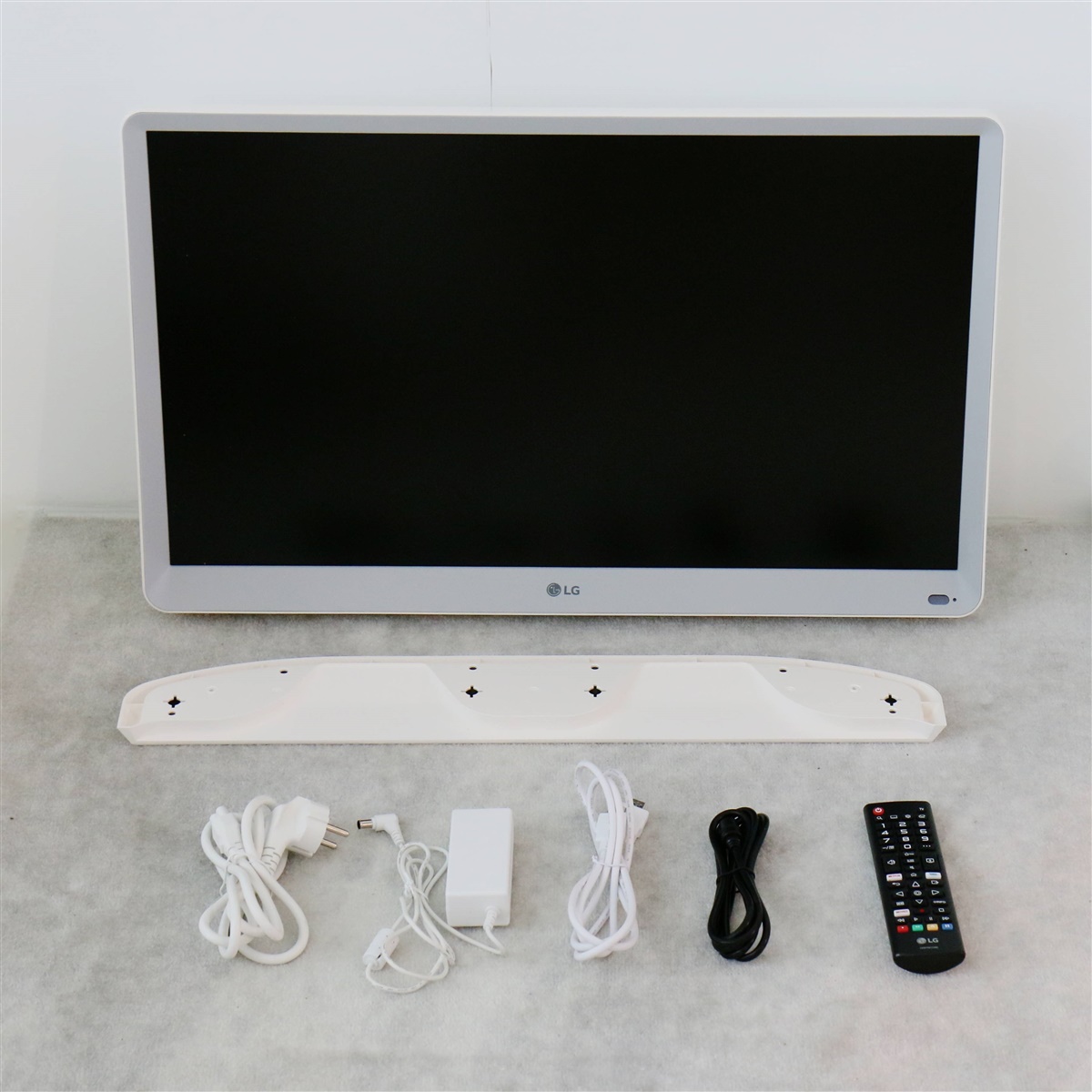 룸앤TV 모니터 본체와 전용 받침대 커버, 전원 코드, 어댑터, HDMI 케이블, RF 케이블, 리모콘 구성품입니다.