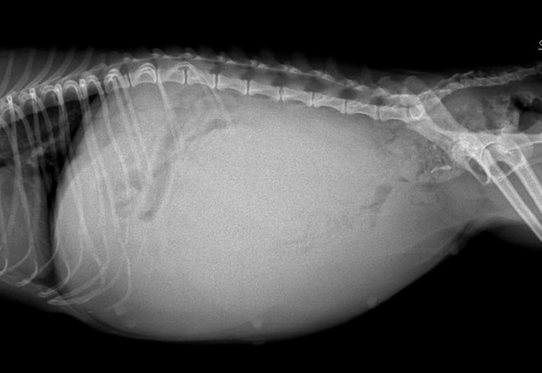 환자는 체중이 2.2킬로그램으로 몸집이 작고, 배가 상당히 부풀어 있었습니다.복부의 상태를 확인하기 위해 엑스레이를 촬영한 사진을 보도록 합시다.